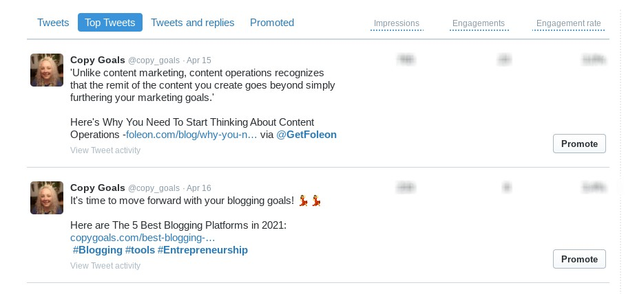 For example, on Twitter, you can see the number of impressions and engagement rates for your tweets:
